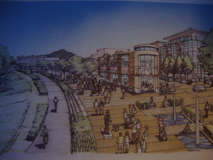 I noticed this image accompanying an article in the EWEB newsletter Pipeline, which was mailed to my house the other day. (The best part — look really closely — is the guy standing on a tiny stage playing a saxophone through a little amp to a small crowd of most attentive bystanders, including a child with a balloon.) The headline accompanying this article announces that the area will be “teeming with people walking, shopping, cycling, eating …”