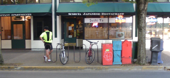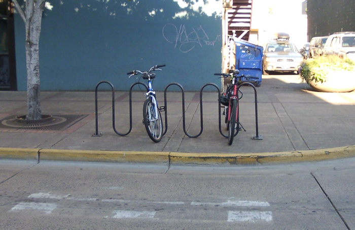 That said: Sure, there are some parts of downtown where it would be nice to have a little more in the way of places to lock a bike. I second what Mike wrote over at WeBikeEugene about not getting militant about it. I mean, the last thing we need is a bunch of cyclists bitching and moaning about how we’re victimized and marginalized. Nobody wants to hear that, right?