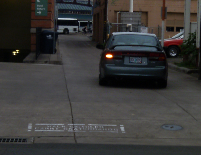 Sigh. The paint and stencils were probably very cheap. The labor for fixing mistakes = waste, but you know, that happens. Cycling on sidewalks in dowtown Eugene is usually not a problem, but there are many who ignore the rights of others and ride quickly and carelessly. I’m not sure anyone expects the signage will completely eradicate the problem, but if it stems the tide, downtown will be safer and more pedestrian friendly and that’s good for more people. It’s also nice for them to post these signs where many cities do not. In most places, like NYC where I saw it happen many times, the cops just crack skulls and bully the people who ride dangerously on the sidewalk.