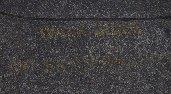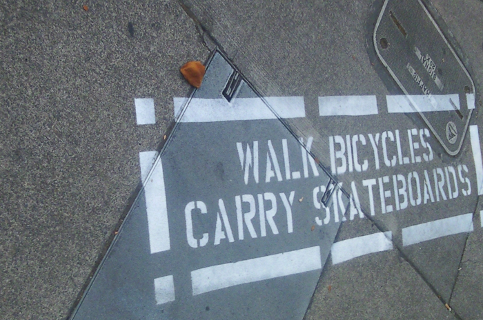 Yes, well, the word “no” is a little harsh. We wouldn’t want anyone to read that and think you could not have a skateboard at all. But skaters were institutionally discriminated against back in those days. The new wording, “WALK BIKES CARRY SKATEBOARDS,” puts the two on more equal footing perhaps.