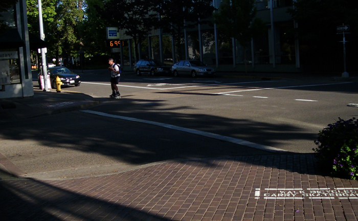 … as we can see from this guy, who is about to roll right up onto the sidewalk. And who then did so, as he headed up Willamette Street to the Hult Center for roller derby.