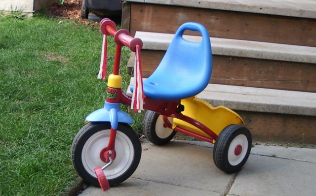 No coasting possible here. And you will notice this machine’s utter lack of any brakes at all. Why? Because fixies don’t need brakes. A practiced toddler can simply slow the pedaling motion to reduce the speed of the wheel and bring his Fold2Go trike to a stop.