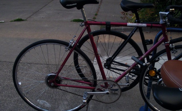Lest you think the poor man’s fixie is an anomaly, here’s another one, seen rolling south on Willamette Street: