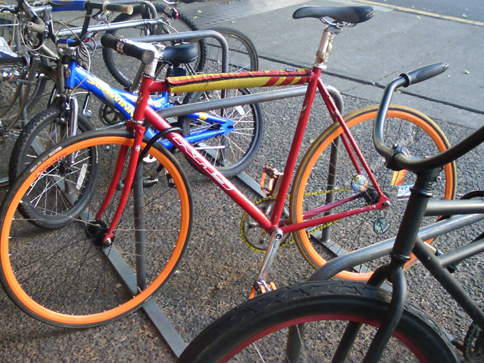 It would be like hating a kitten. But if you do notice me roll my eyes, it has less to do with the actual mechanical arrangement known as the fixed gear and more to do with all the trimmings that sometimes come along for the ride — such as this bike’s yam-like orangeness.