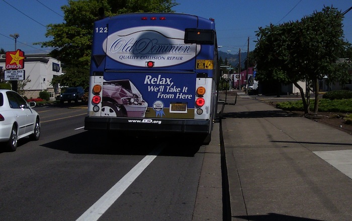 When I was in Seattle recently, riding the bus through a neighborhood with bike lanes and narrow streets, I noticed that the driver was consistently stopping his bus directly in the main lane of auto traffic in order to avoid blocking the bike lane. When confronted by a frustrated bus rider accustomed to stepping right from the curb onto the bus, the driver explained that he had been instructed by the police to avoid stopping in the bike lane at all costs. I have yet to notice an LTD driver avoid stopping in the bike lane, but I only ride the bus once or twice a week.