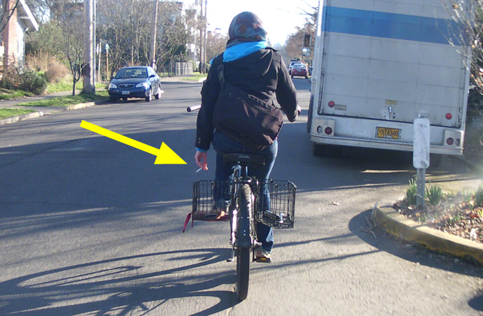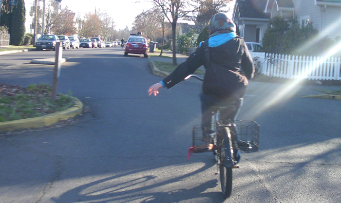 … or … wait … is she perhaps offering me a drag? Oh, no. Actually it turns out she was signaling a left turn, very considerately.