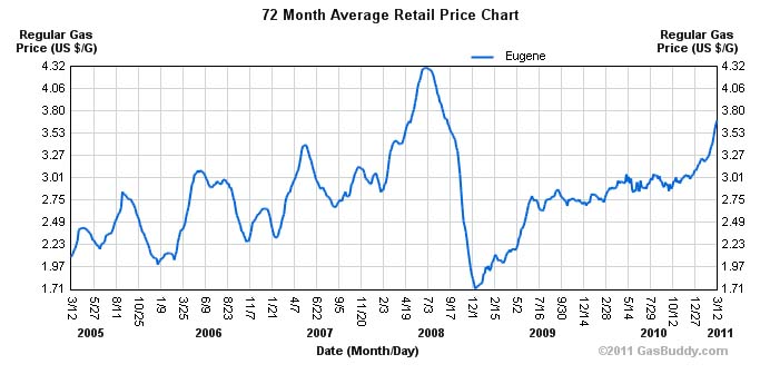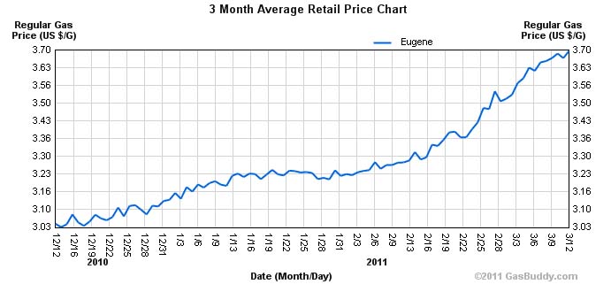 But most people in Eugene have been noticing. Here’s the average price of regular gasoline in Eugene over the past three months: