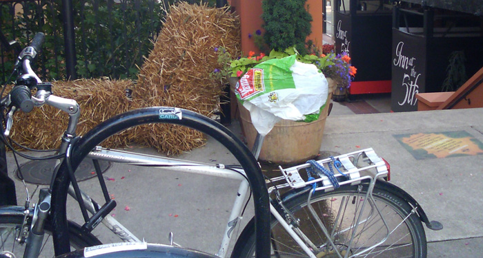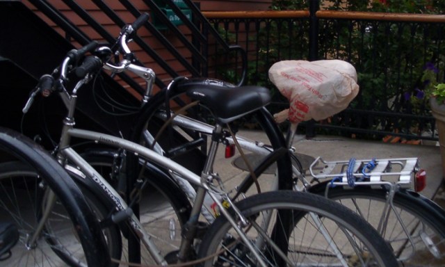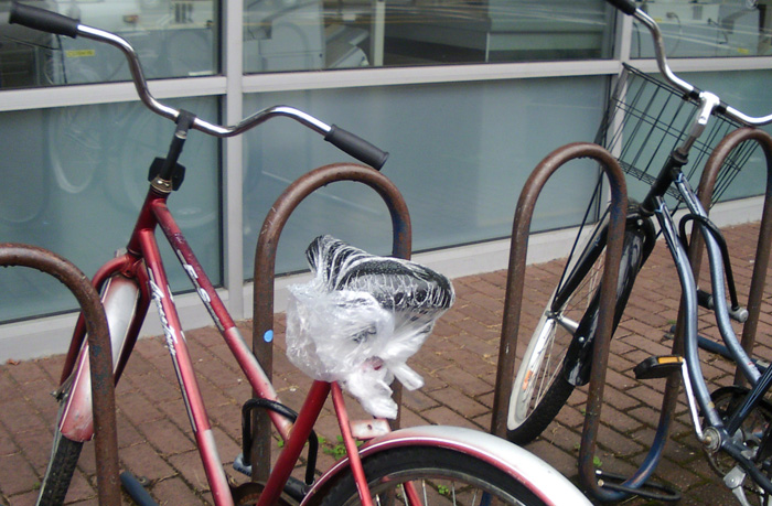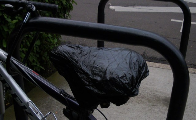 Short of that, there is a simple and effective way to practice safe outdoor winter/spring bicycle parking. Technically known as the “petroleum-based prophylactic seat cover,” most of us know it as the “plastic bag” (because it may be a difficult mental reconciliation for cyclists who are snooty about not using petroleum.)