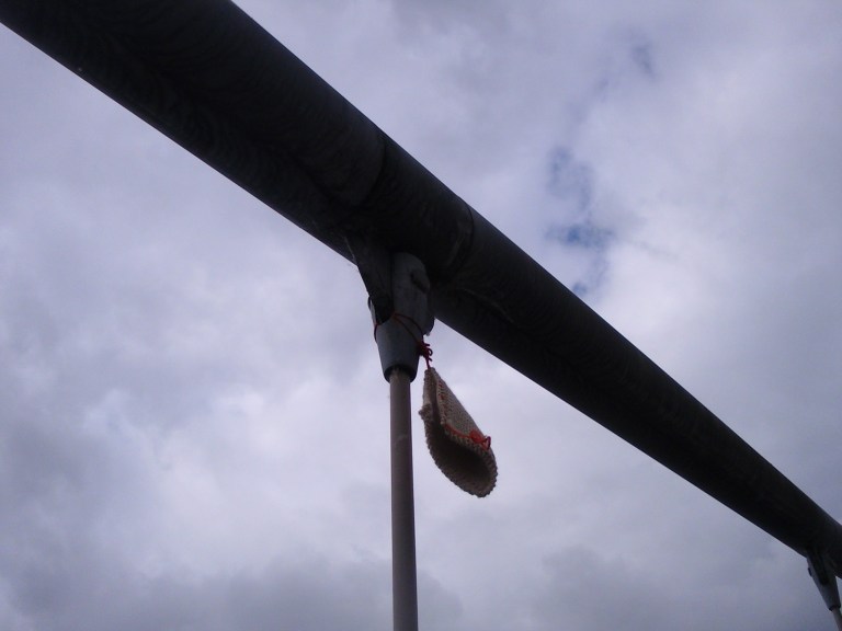 Speaking of bridges, we were so excited to see the “yarn bombing” on the Defazio bike pedestrian bridge. But by the time Eugene Bicyclist got over to see what was going on, all that was left was this little napkin, way up high.