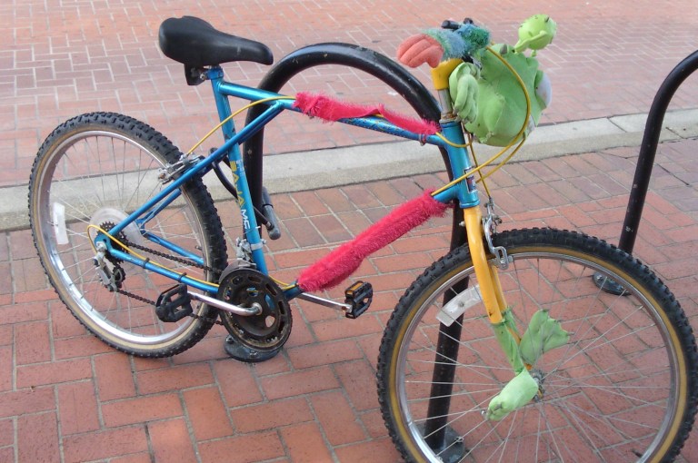 A bicycle decorated with character from the movie Monsters Inc.We believe this is the character Mike Wazowski (voiced by Billy Crystal) from the kids’ film “Monsters Inc.”