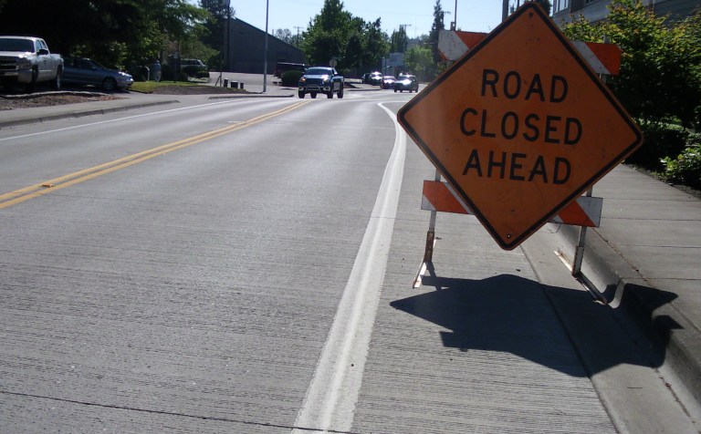 This is looking east on Shelton-McMurphy Boulevard, just west of Pearl, by the way. And yet, the road didn’t actually seem to be closed ahead.