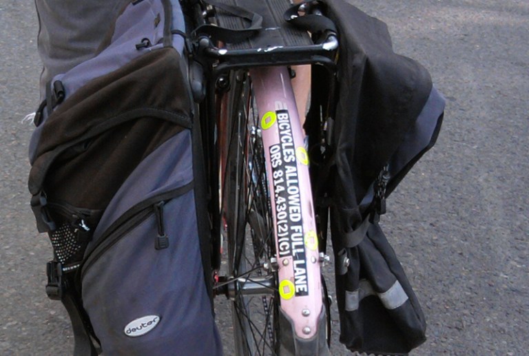 The first law applicable here is ORS 814.430, which you could call the “take the lane law.” It says essentially that cyclists have to stay to the right edge of the road, but it also spells out several exceptions — situations where it is legal to move into the car lane.