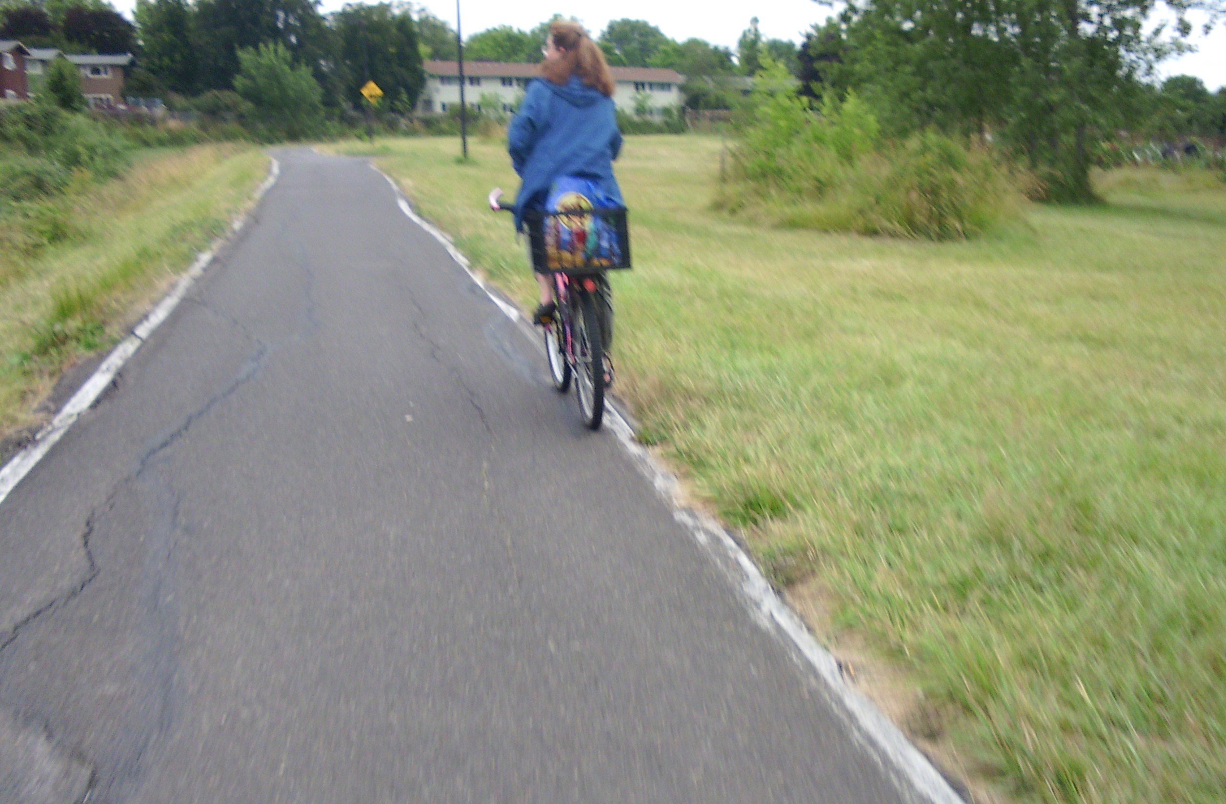 And today’s route of Le Tour de Milk Crate took us up and over the dangerous Côte de Fern Ridgino. Here, a rider concerned about the press fixie coming up behind her nearly veers off the treacherously narrow, crack-riddled path.
