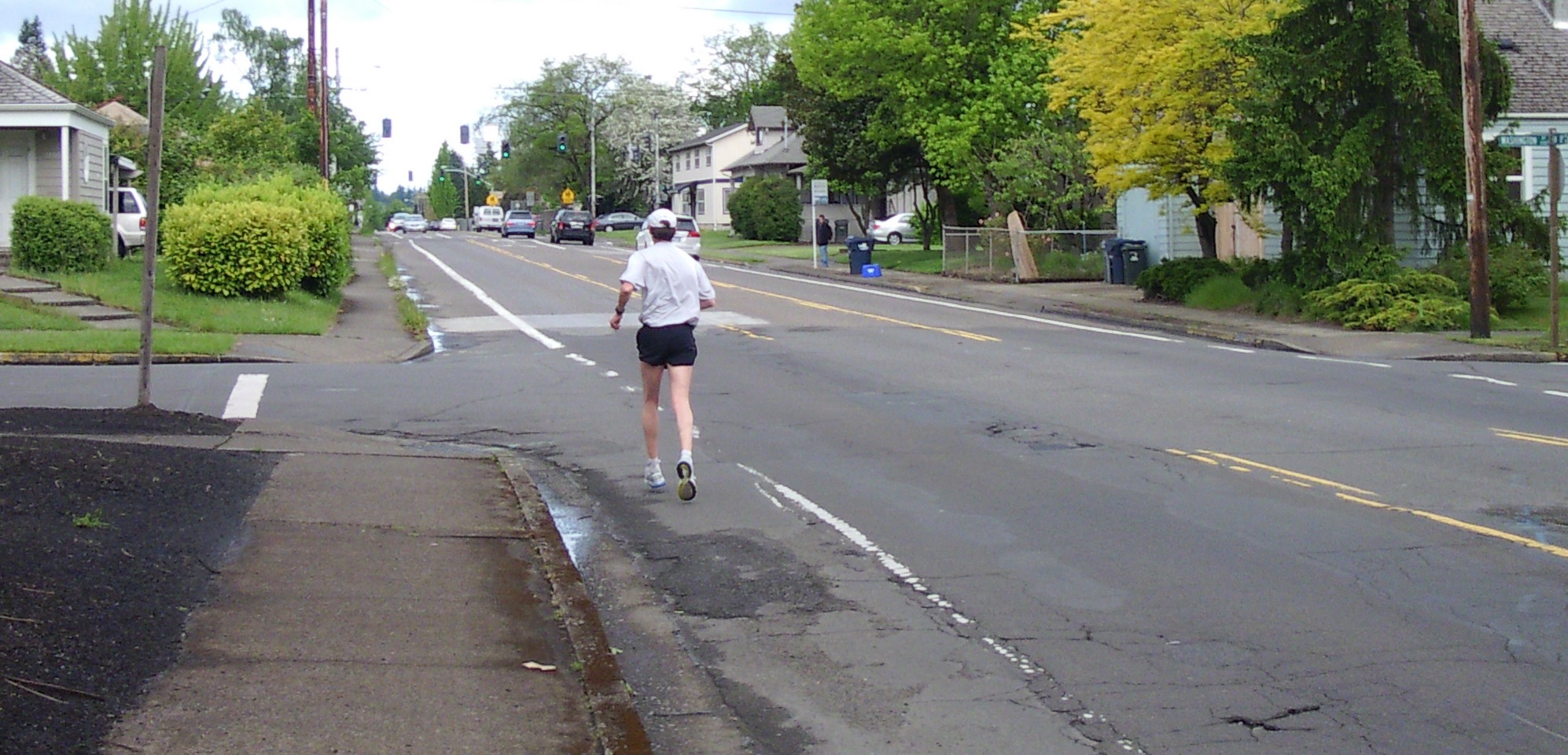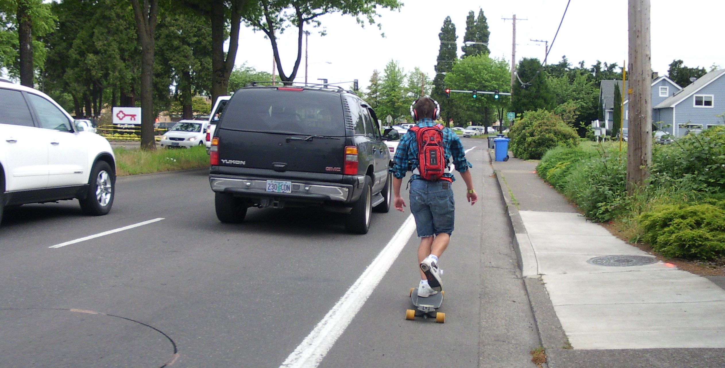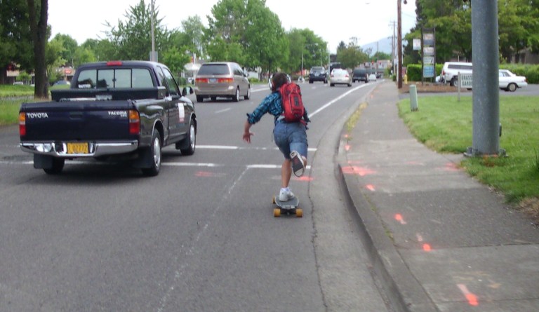 He was a pretty nice guy. At a red light, he came up behind me after I passed him (outside of the bike lane). One or the other of us — I don’t remember who — struck up a conversation. He told me he was skateboarding from south Eugene to Costco to get his eyeglasses fitted — 13 miles round trip, he said.