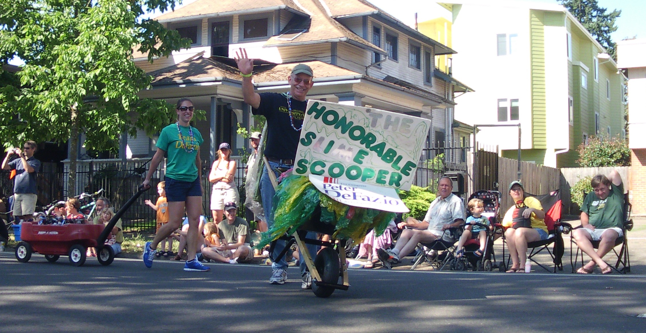 As is often the case with this sort of thing, DeFazio was a key player, having smuggled something like 2.7 million bucks out of Washington, D.C., using that same wheelbarrow he pushes in the Eugene Celebration Parade. Speaking of which, here he is, just a couple of weeks ago: