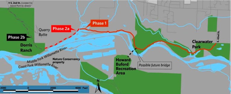 I am told by Willamalane planner Rebecca Gershow that the cash is in hand for Phase 2a (thanks again, Pete!), which will take the path around Quarry Butte to Dorris Ranch. Willamalane is hoping construction begins early next summer, as soon as things dry out enough.