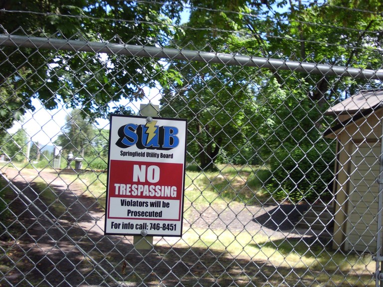 Alas, there are some signs of civilization, as you come upon a chain link fence meant to keep you out of some electrical facility run by the Springfield Utility Board: