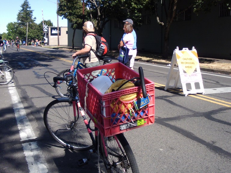 It had a different feel than the one Sunday Parkways thing I’ve been to in Portland. I think the larger mass of people in Portland kept things a little more organized, and the residential streets were more interesting to see. It was fun the way the residents would set up sprinklers to ride through or lemonade stands or whatever – it felt like they were sharing their neighborhood.