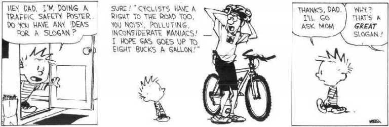 Well, maybe it’s not all that different from people who say bicycles have no place on the road: people who cannot cope with change; people who would call the newspaper to complain if “Hagar the Horrible” — or heaven forbid “Peanuts” — ceased to be in the paper — which is probably why they are still there; people for whom any change at all is threatening; people for whom a new bike lane is an outrage.