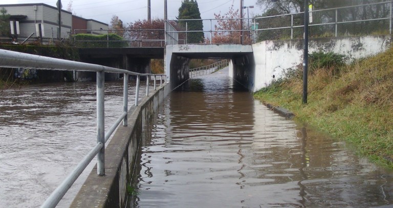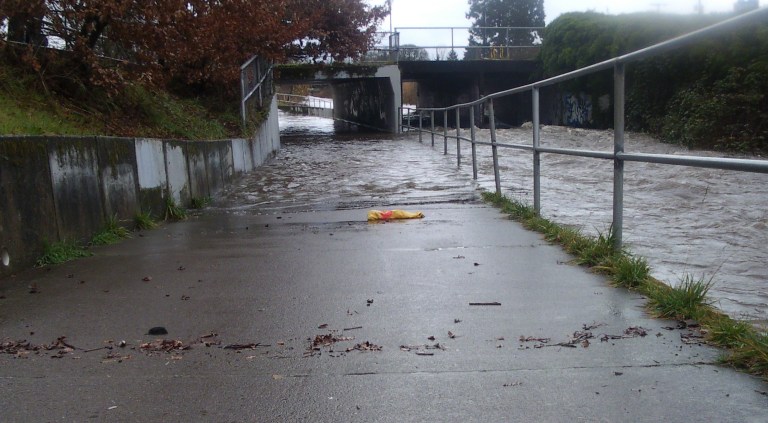 “Massive flooding has blocked the Fern Ridge Path today and CHAOS has ensued, forcing cyclists to be late for work, abandon routine dental appointments and decide that they would just go ahead and keep that too large sweater they got for Christmas and had intended to return to Target. Rock is in the newsroom with more. Rock? …”