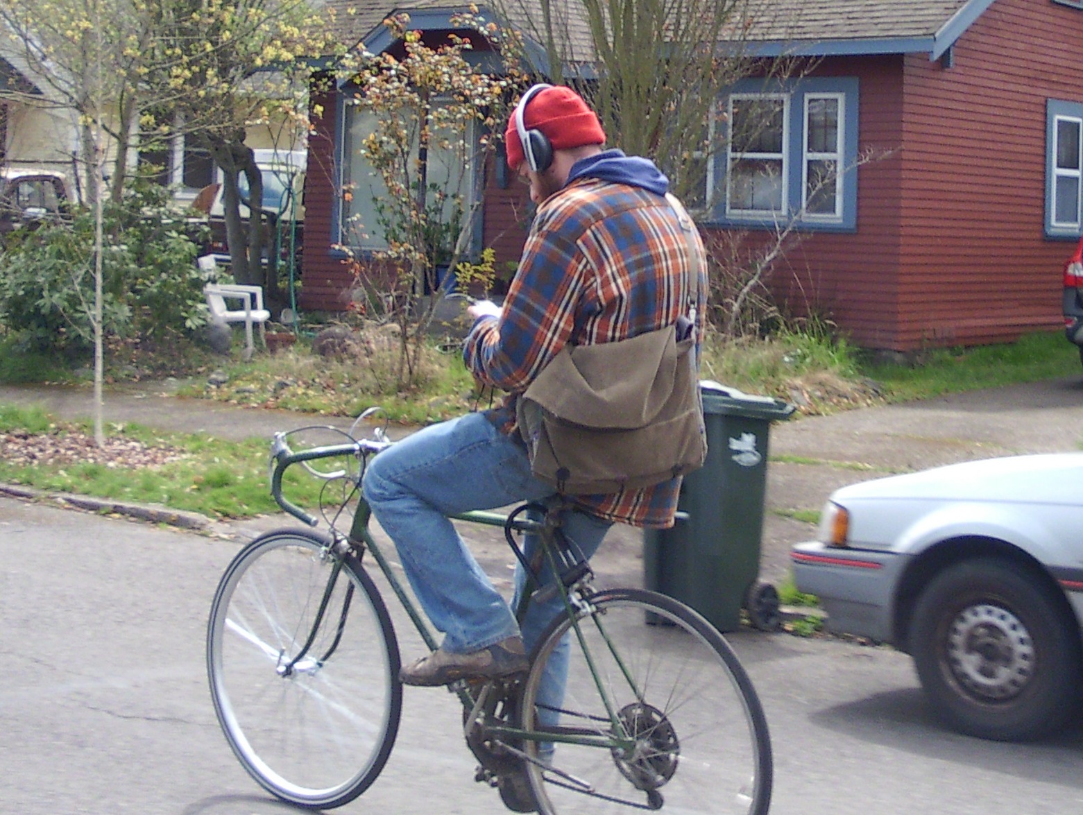 1) Hands off bars, 2) Viewing interactive device, not road, 3) Headphones, 4) Lock could affect pedaling, rear brake operation, 5) Without pants clip; snag hazard, 6) Weak kickstand spring; kickstand could interfere with pedaling, and 7) Flannel (though I’ve been guilty of this as well). I also wonder whether it really was garbage day and, if so, whether the car in the picture went to the landfill along with the contents of the garbage tote because of their proximity.