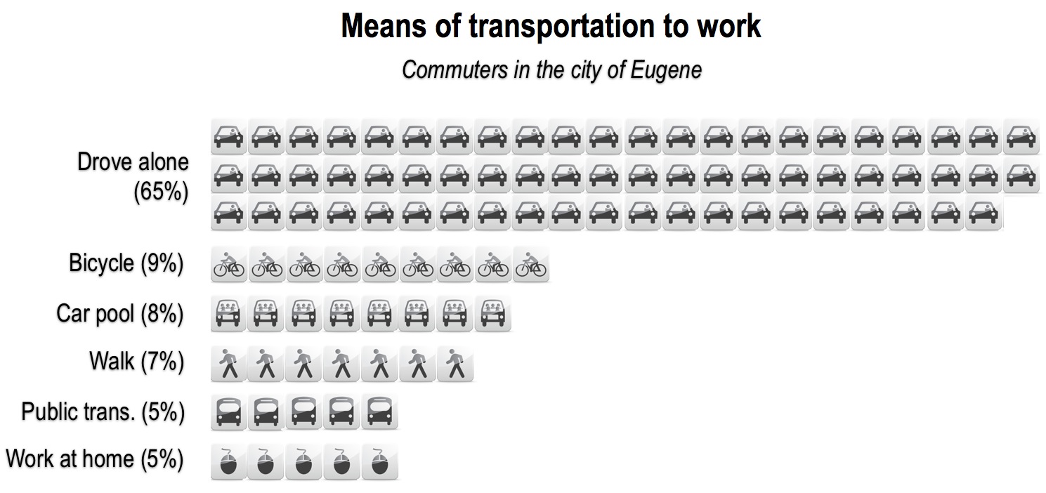 But I got wondering specifically about Eugene. I couldn’t find any data about “bicycle trips” — or bicycle errands. But the United States Census Bureau kindly offers us information by city about how people commute to work.