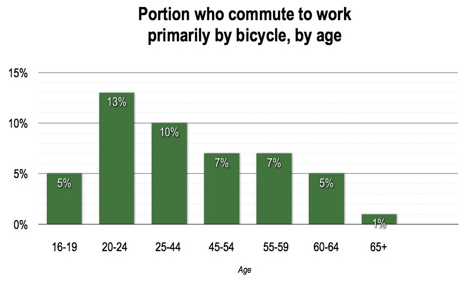 So as long as we are mucking around on the Census Bureau website, here’s the percentage of people in Eugene in various age groups who use a bicycle as their primary means of getting to work:
