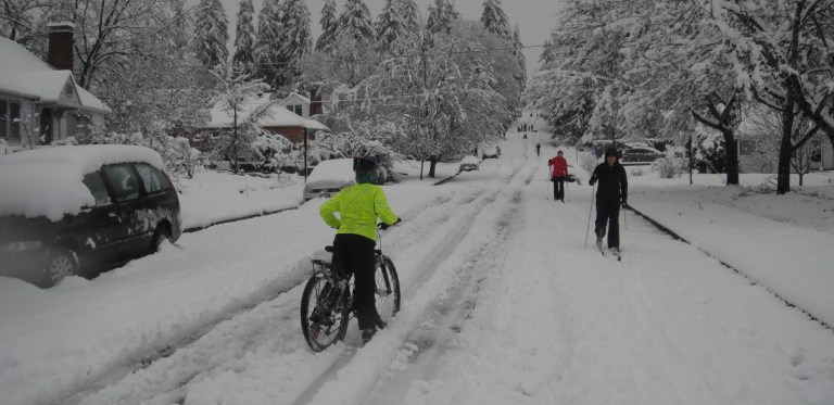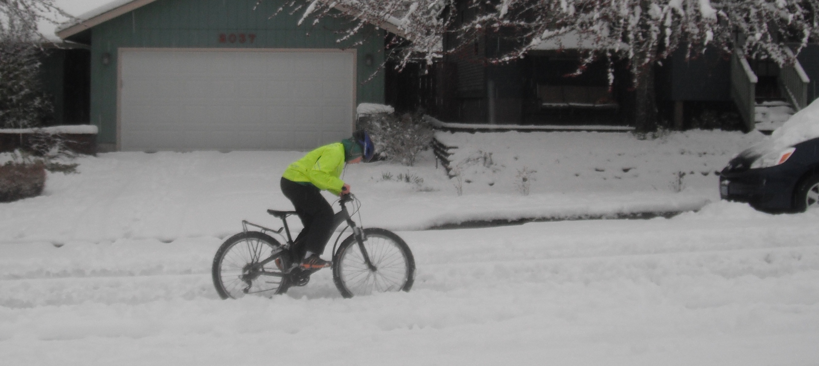 Yes, there are intrepid souls out there today — like this determined young man trying to ride up the hill at Lawrence and 20th or so, by Washington Park.