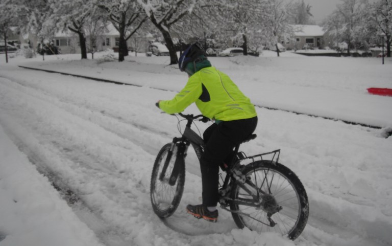 Mountain bikes are not the best in the snow. BMX bikes seem to work better, that’s what I commuted on in Illinois snow. I miss that.
