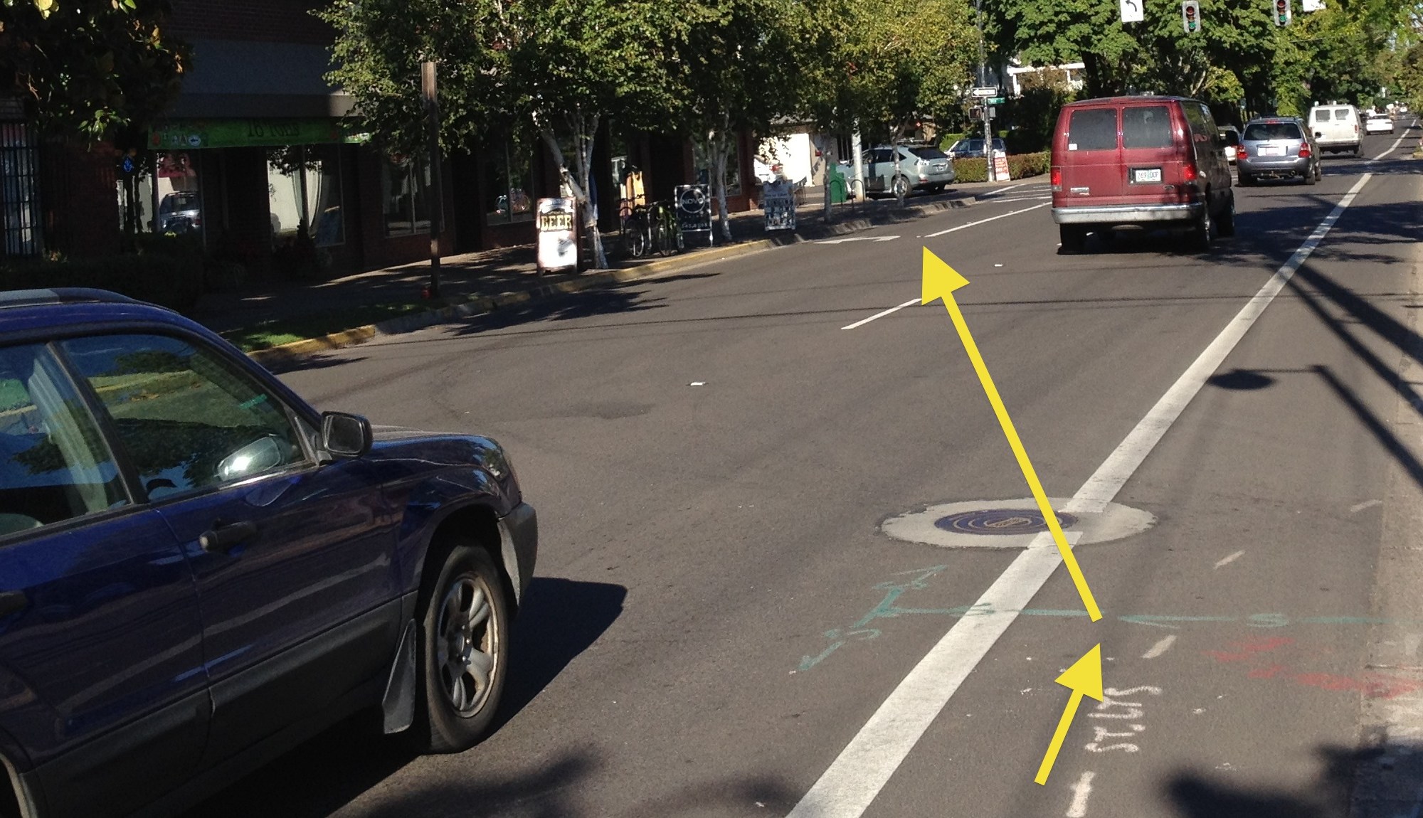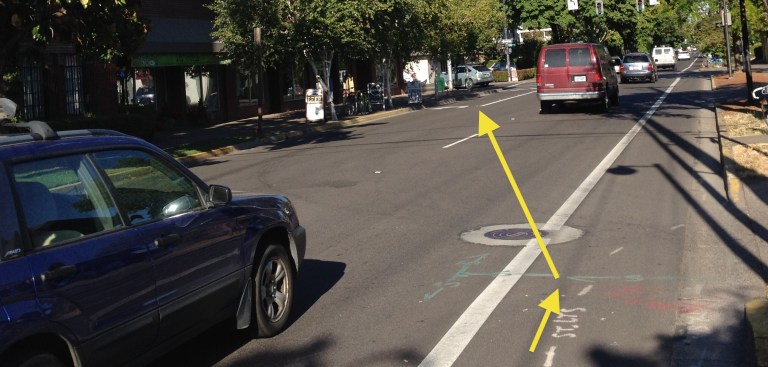 Oftentimes, I just come to almost a complete stop in the bike lane, waiting for the line of cars to clear, and then merge over. This day I was feeling a little more lively I guess.