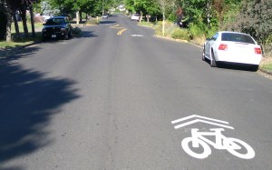 Don’t misunderstand. A lot of people do wave and smile. Most motorists — and cyclists, too, I think — try to share the road and be considerate. But if you listen to serious cycling advocates — and I don’t necessarily consider myself one — you will hear many say that what we really need are better ways to separate bikes and cars. In fact, there are some good people in Eugene who are working very hard to do this, to create more routes like the new “cycle track” on Alder Street, although that certainly isn’t a perfect solution.